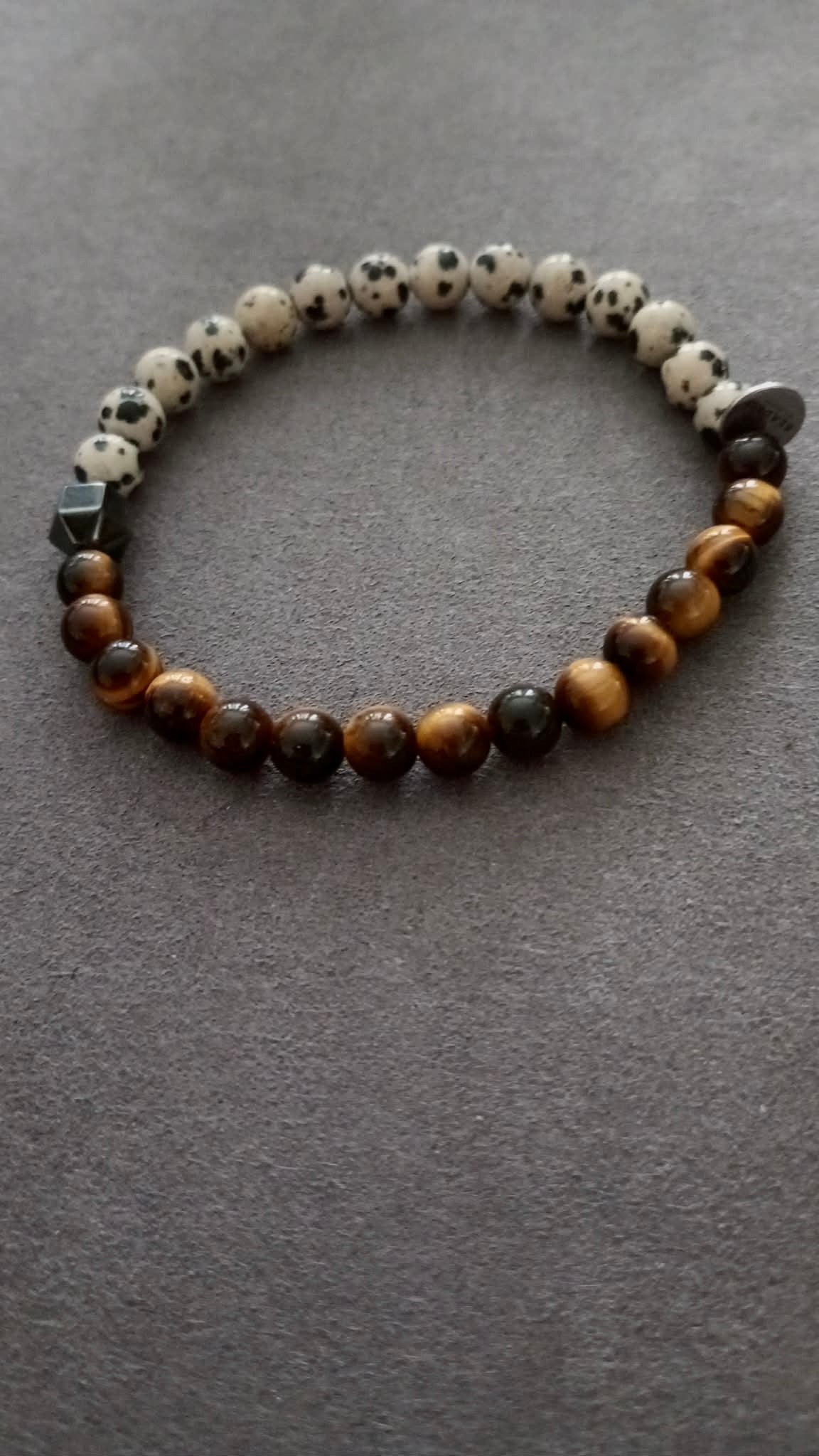 DETAILS: Smooth 6mm dalmatian jasper, tiger's eye beads, finished with hematite bead and stainless steel branded coin. Elasticated for comfortable wear.