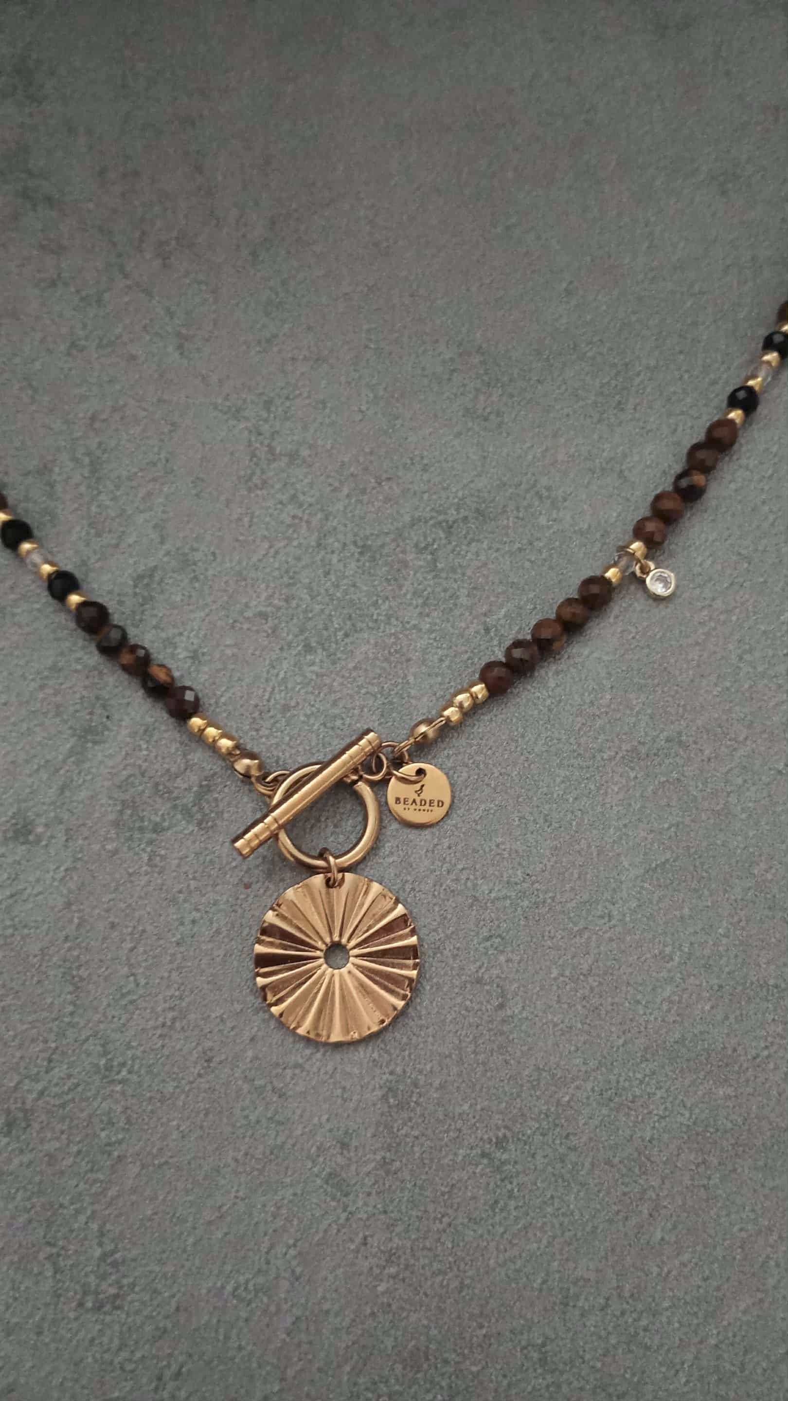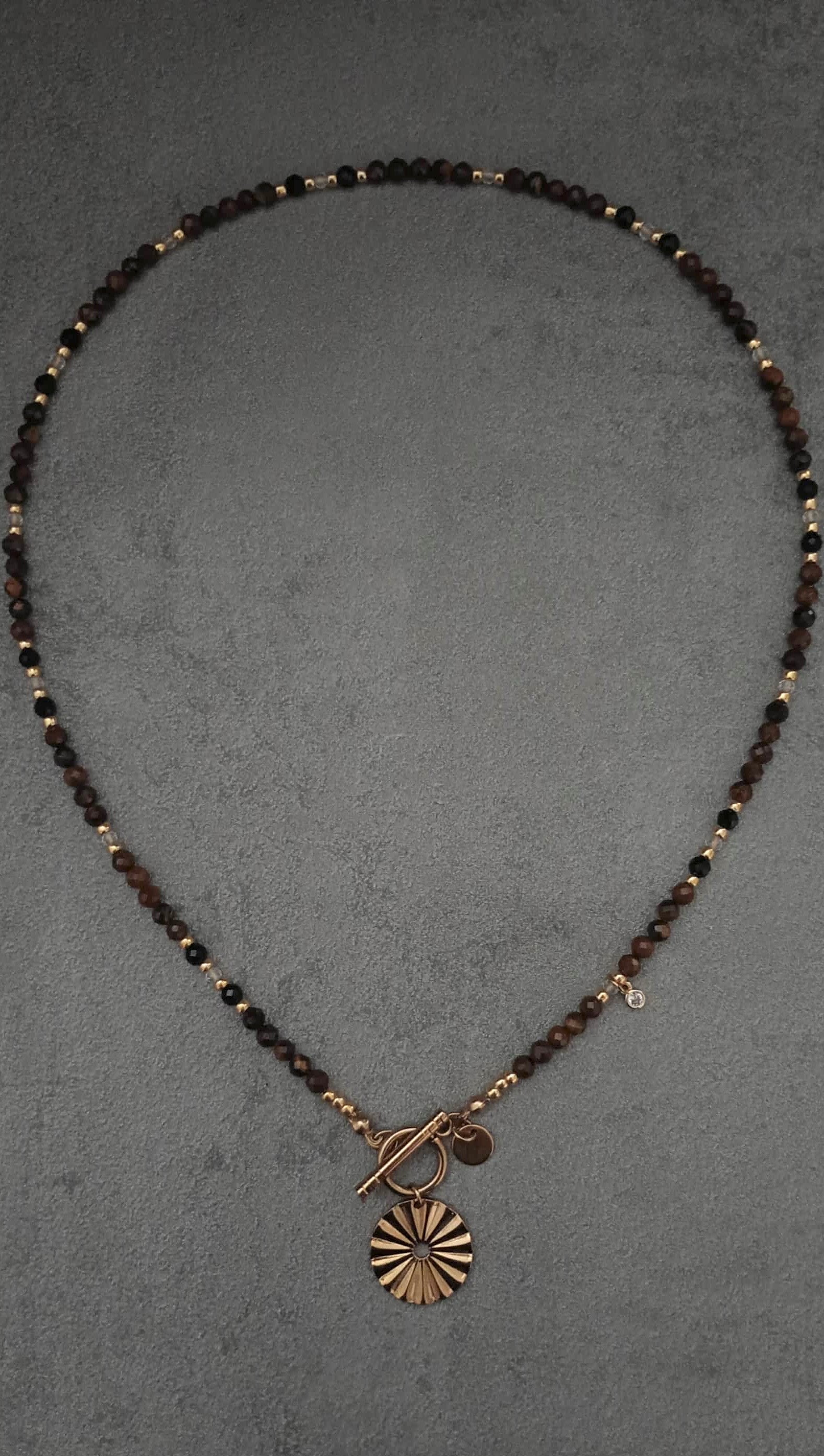 DETAILS: 4mm faceted tiger's eye and black tourmaline beads, 3mm faceted clear quartz and gold tone TOHO beads. Stainless steel ridged coin pendant in gold tones
