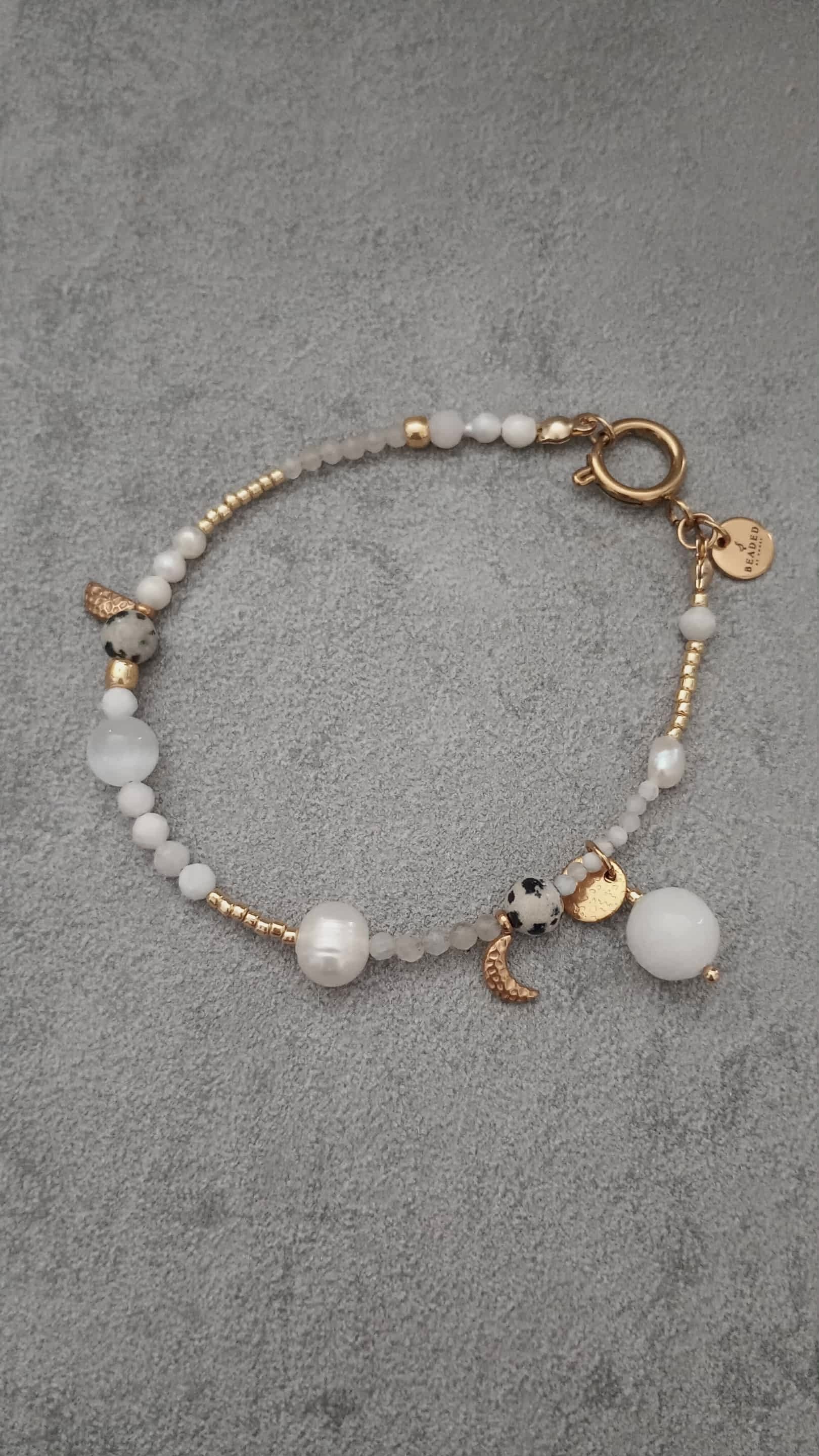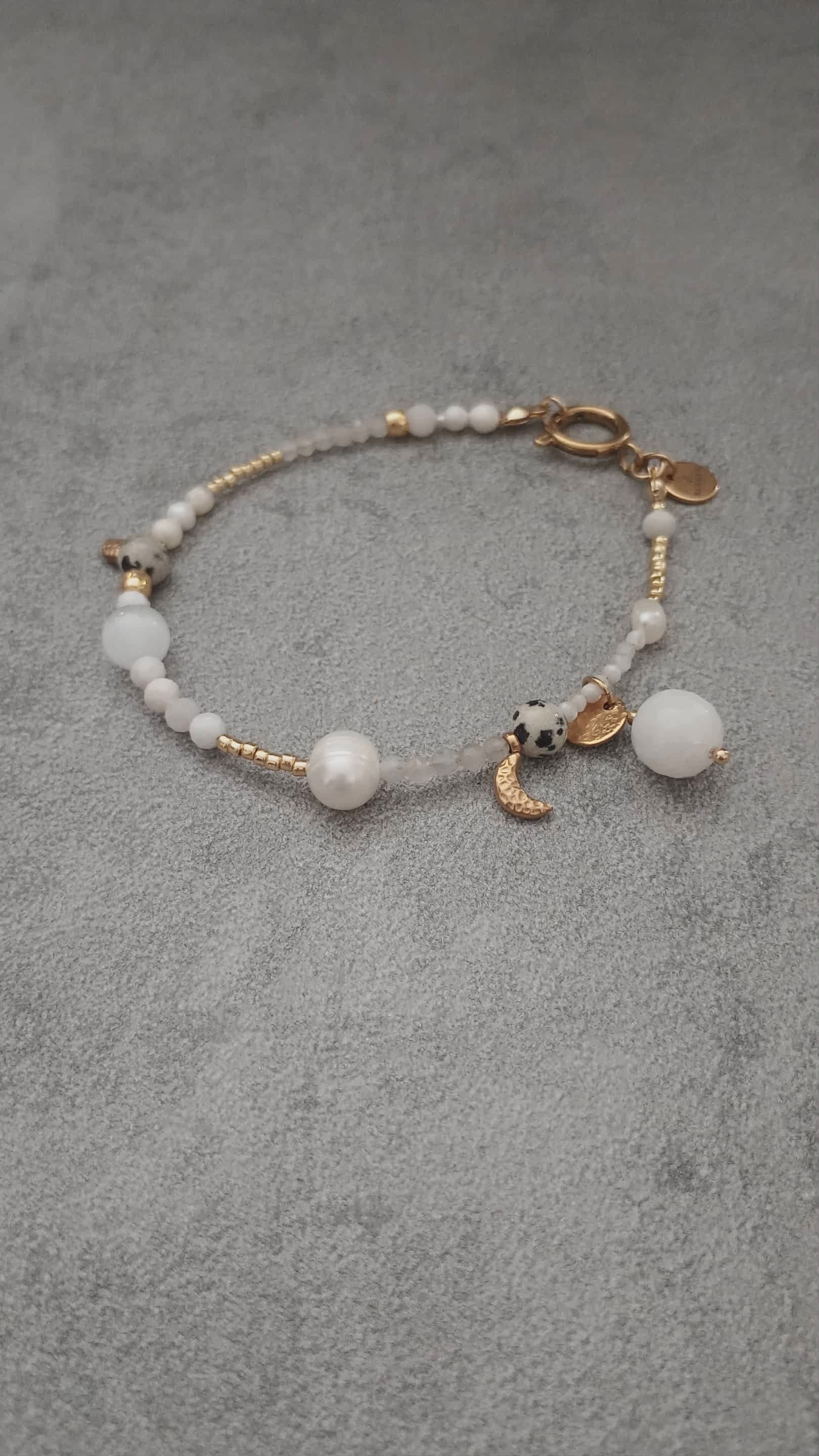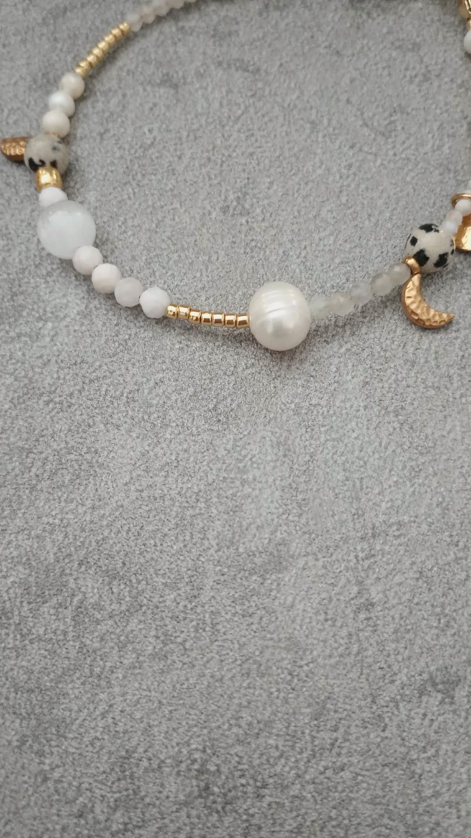 nº1 - the light one. Freshwater pearl, moonstone, labradorite, dalmatian jasper, jade & selenite — calming, uplifting, and balancing energies