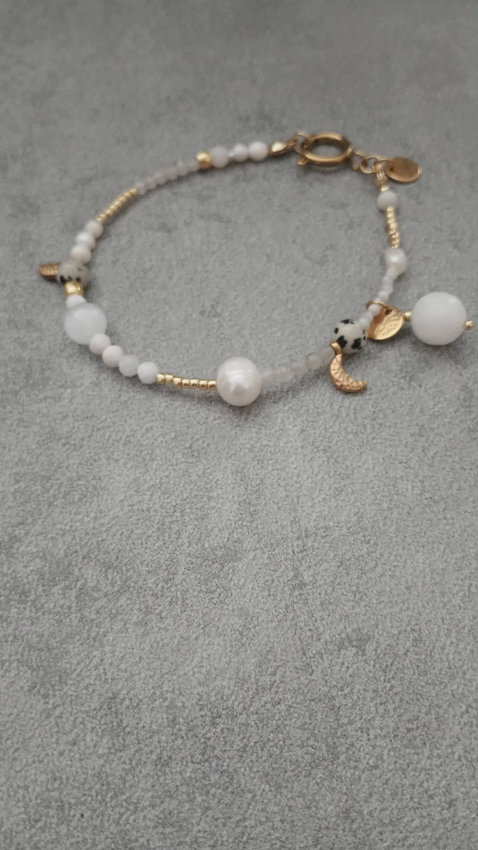 DETAILS:  A mix of smooth and faceted natural stones & freshwater pearls.  2-8 mm beads: freshwater pearl, moonstone, labradorite, dalmatian jasper, jade, selenite, 2mm gold tone TOHO beads, stainless steel crescent & round charms, stainless steel spring clasp in gold tones