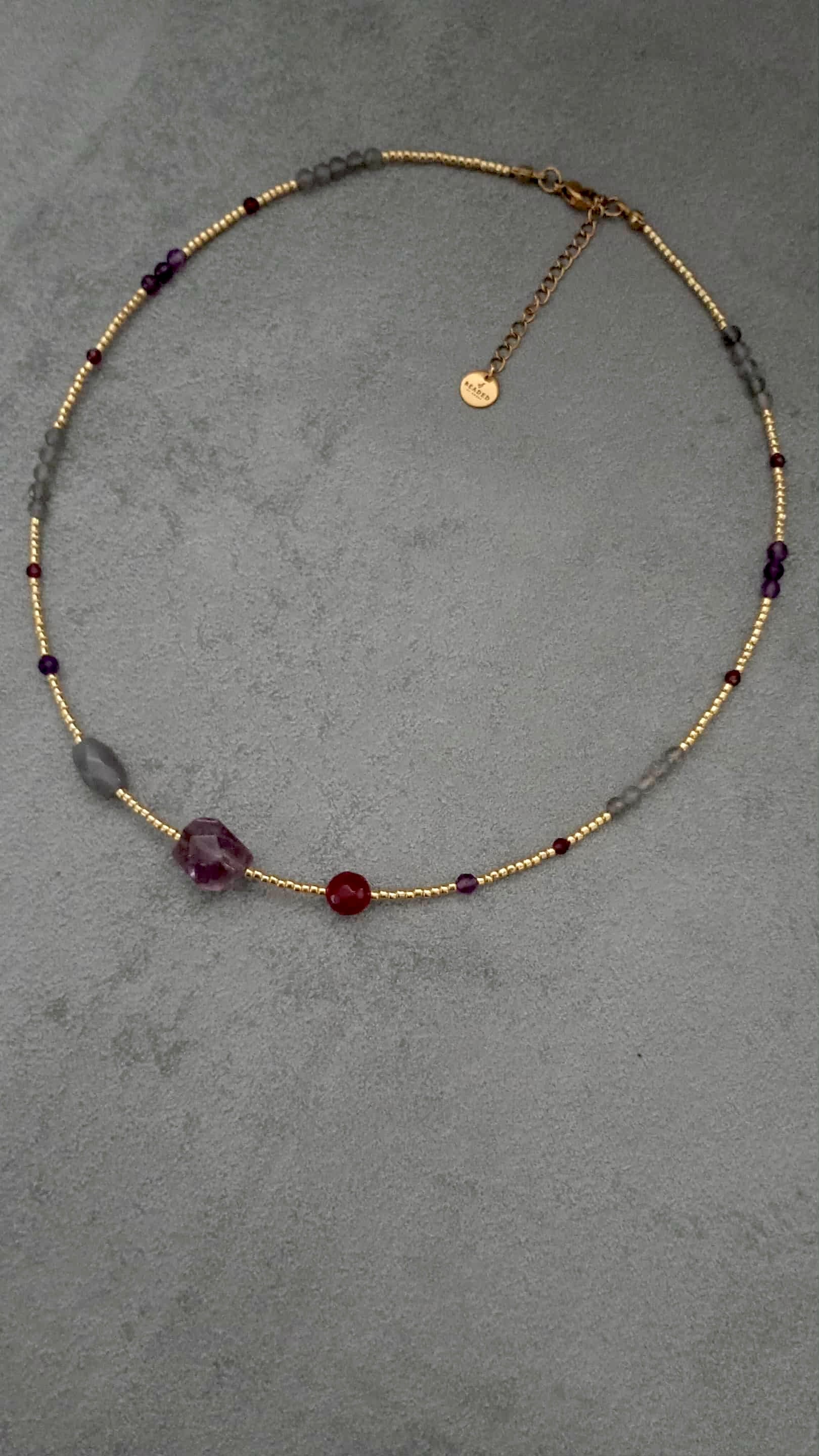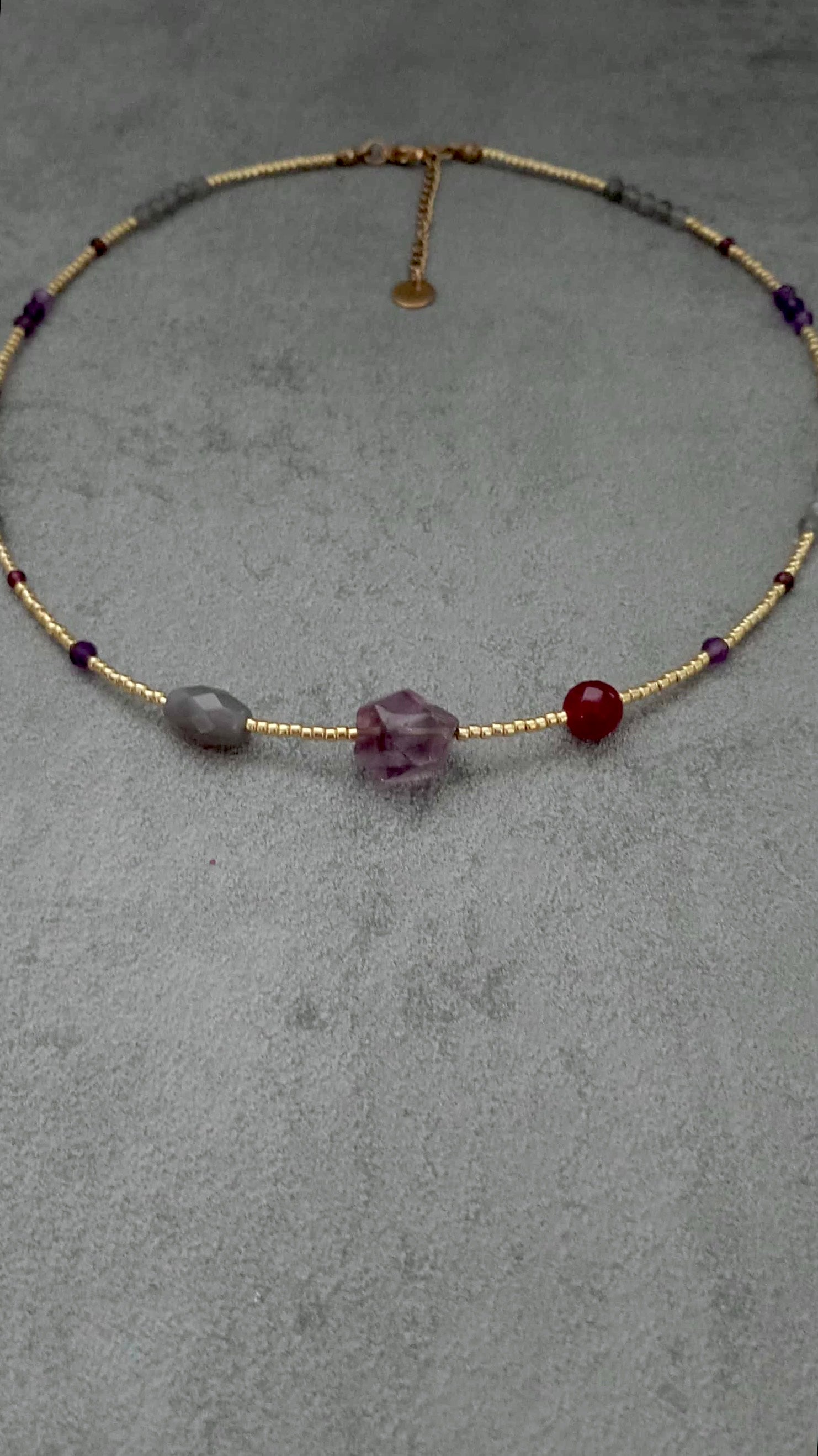 DETAILS: Delicate gold-tone 2mm TOHO beads, faceted 3mm garnet beads, 4mm amethyst beads and 4mm labradorit beads. Large faceted oval amethyst bead in the centre plus 8mm faceted red jade bead and faceted oval grey agate bead.