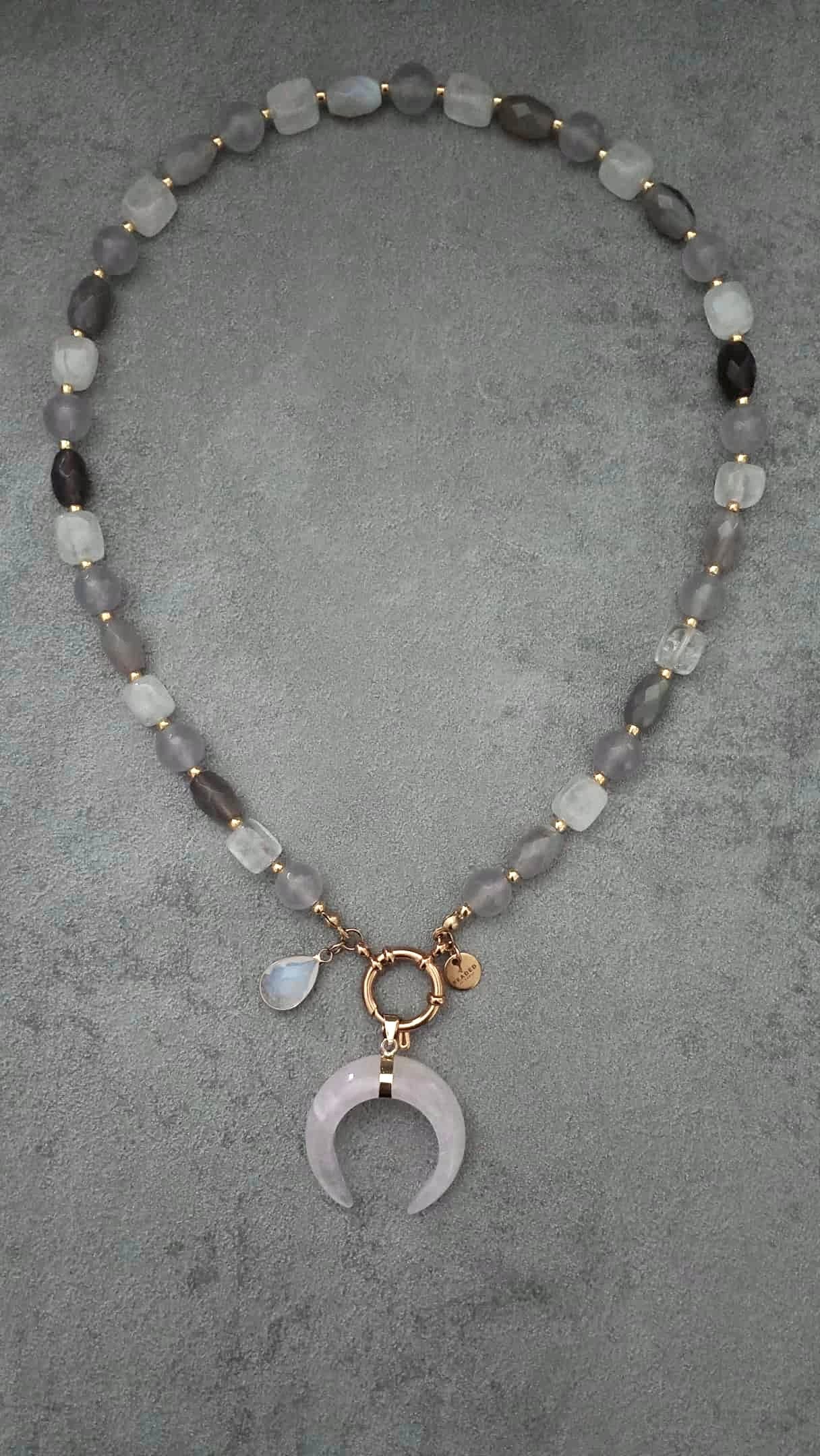 Our EVERLUNA necklace is an ode to serenity — cool, balanced, and quietly powerful. Handcrafted with soft grey jade, agate, and clear quartz, each stone captures the calm strength of mist and moonlight — a harmony of clarity, reflection, and depth.