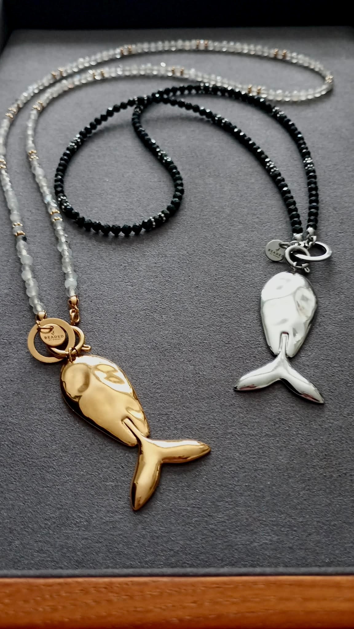 DETAILS: 4mm faceted natural black spinel beads, silver-tone stainless steel whale pendant, stainless steel findings