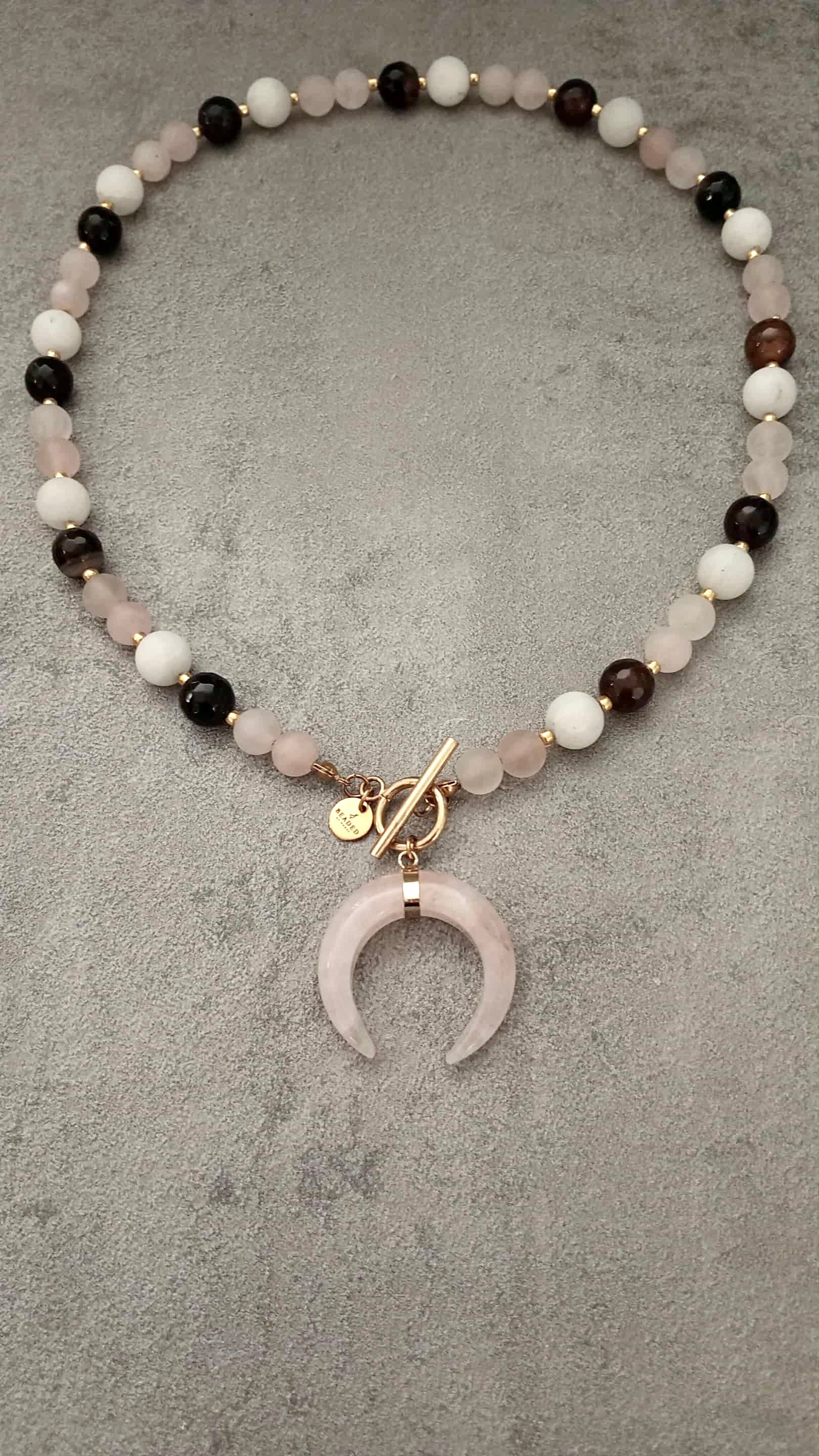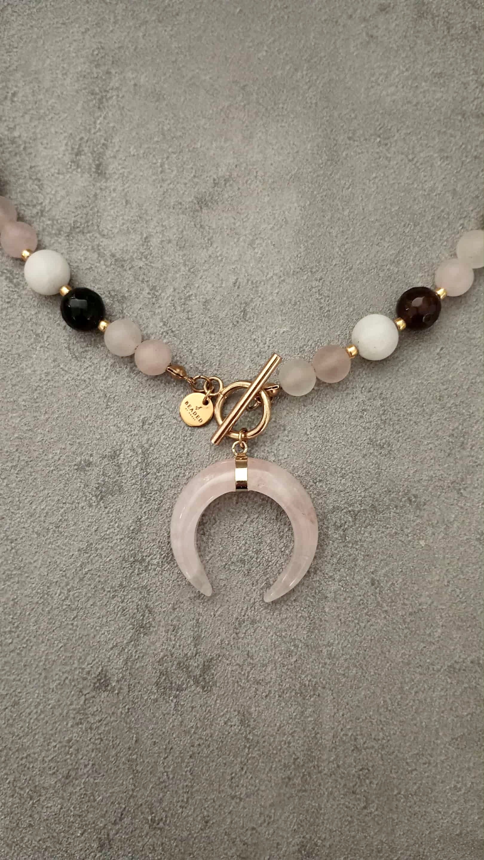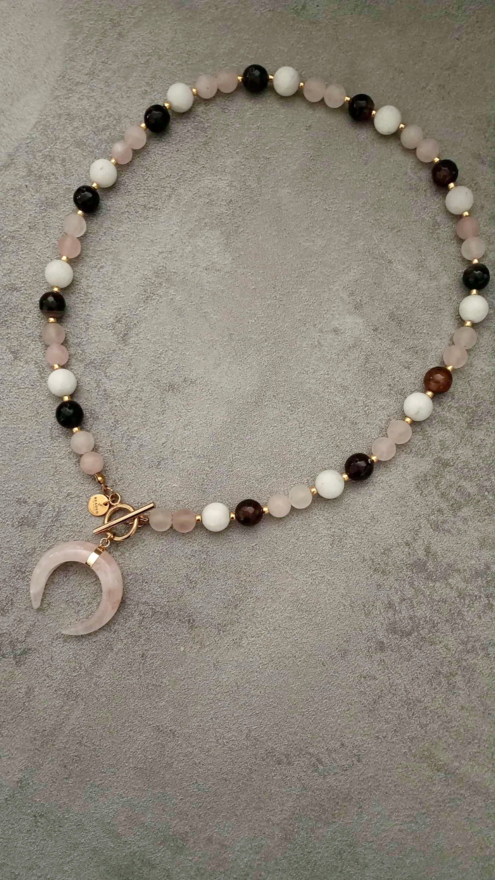 Our LUNELIA necklace brings together soft, calming tones with a touch of ancient symbolism. It features rose quartz for love and warmth, balanced by earthy brown agates and smooth white jade beads. The stainless steel findings add a clean, modern finish, while a rose quartz lunula pendant, a crescent symbol worn by women in ancient cultures as a talisman of protection, fertility, and spiritual grace