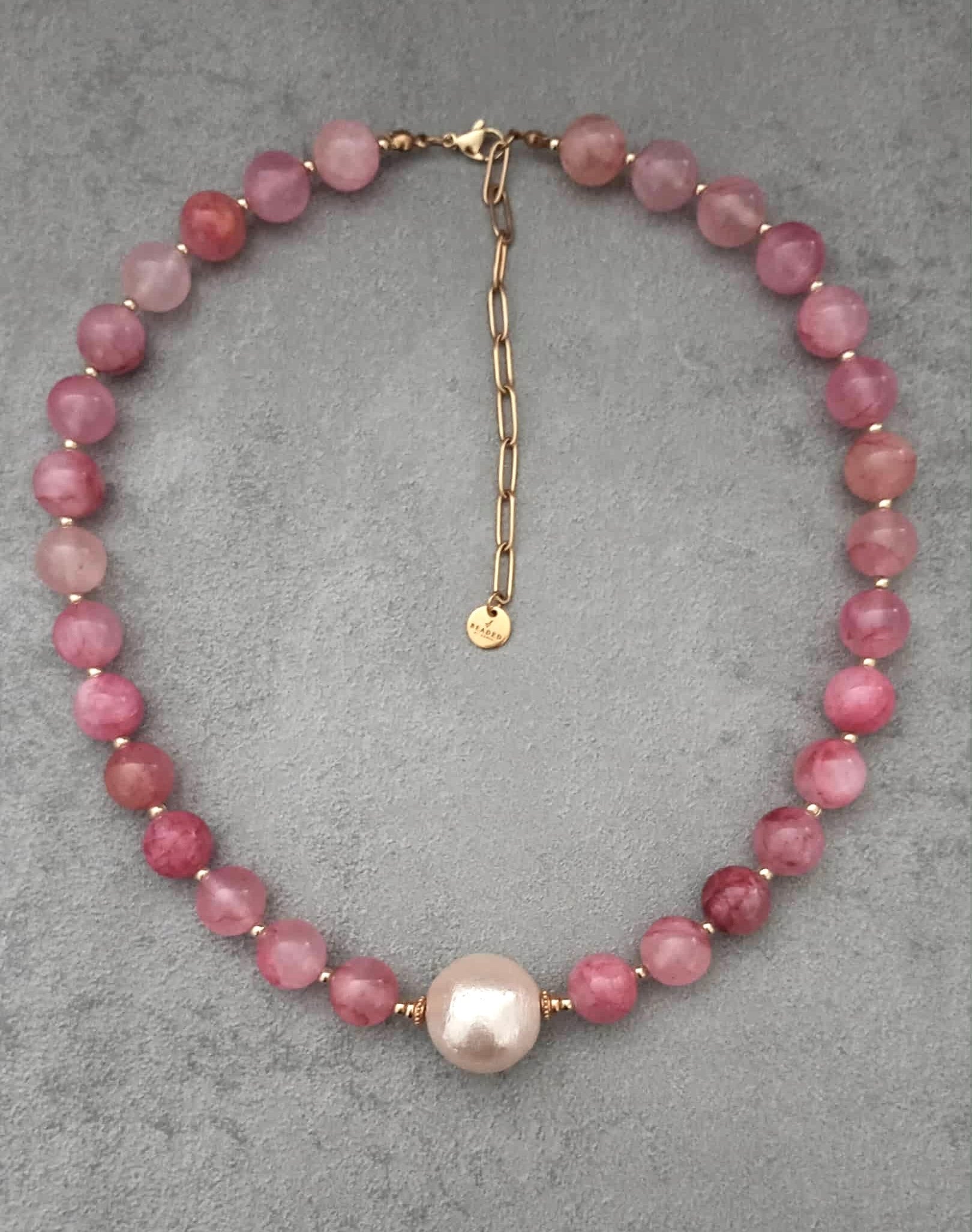 DETAILS: Rose coloured smooth jade beads, pale pink tone cotton pearl, stainless steel elements in gold tones