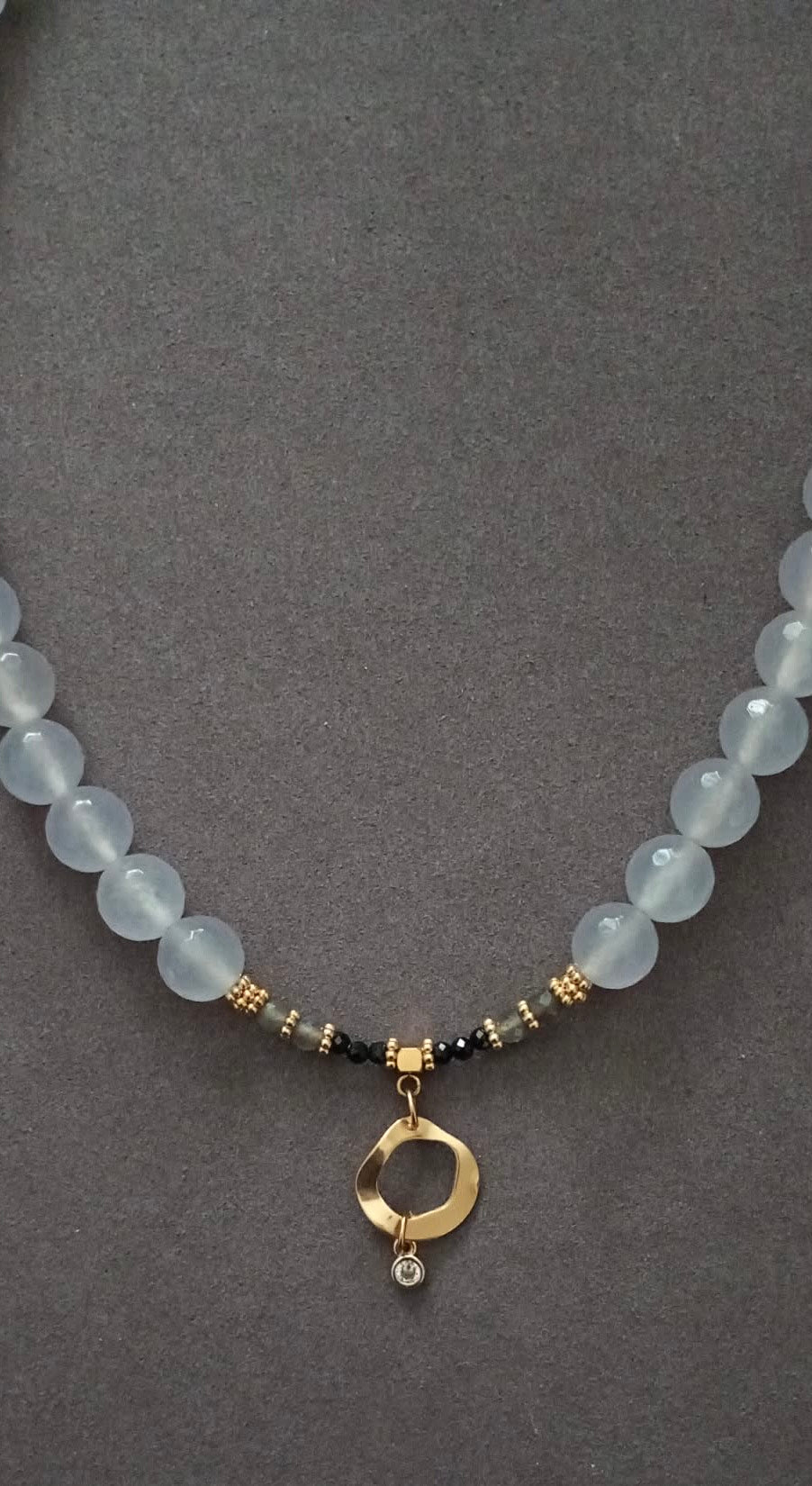 DETAILS: Faceted 10mm light grey jade beads, 4mm labradorite faceted beads and 3mm faceted black tourmalines, stainless steel details and TOHO beads in gold tones